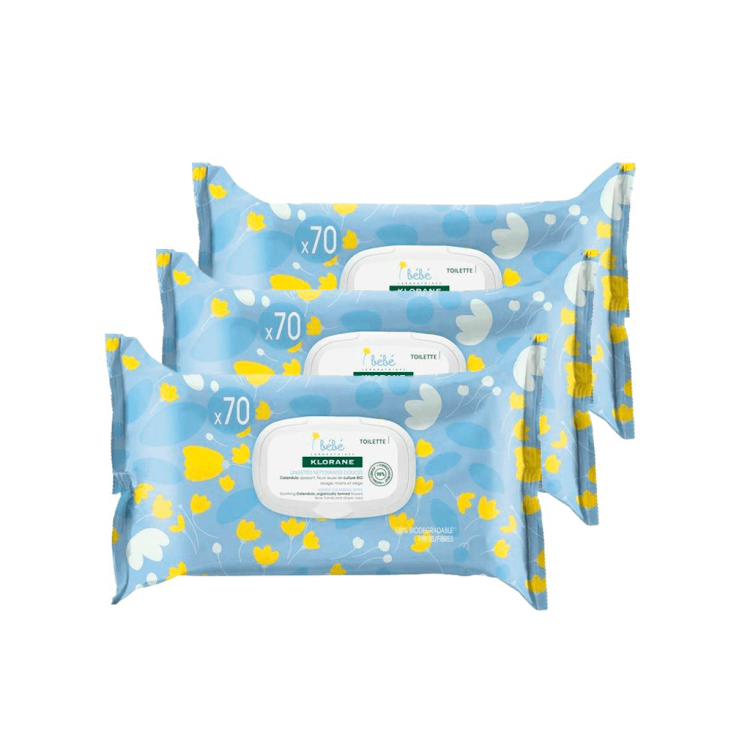 Tolahitas de higine Klorane bebé- Pack de 3 embalagens de 70 toalhitas